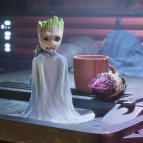 Пытаясь сдвинуть с места неожиданно появившийся бонсай, Грут вместе с ним летит на пол, из-за чего от их горшков остаются только осколки. Малышу ничего не остается, кроме как попробовать совершить свои первые шаги.