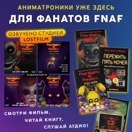 Как и обещали, рассказываем про книги, ставшие сиквелами легендарной игры. После запуска игрового хоррора вселенная FNAF неистово разрослась, и теперь включает в себе множество произведений искусства — от мюзикла до графических романов. Но самыми популярными, пожалуй, стали четыре книги об оживших аниматрониках из серии «Ужасы Фазбера»: «В бассейн!», «Хватайка», «1:35 ночи» и «Подойди ближе». Студия LostFilm взялась озвучить не только свежий фильм по мотивам игры Скотта Коутона, но и подарить новые голоса и необычное прочтение этим тревожным и пробирающим до костей историям. Осторожно: сюжеты книг могут выбить из колеи даже самых бывалых знатоков жанра.